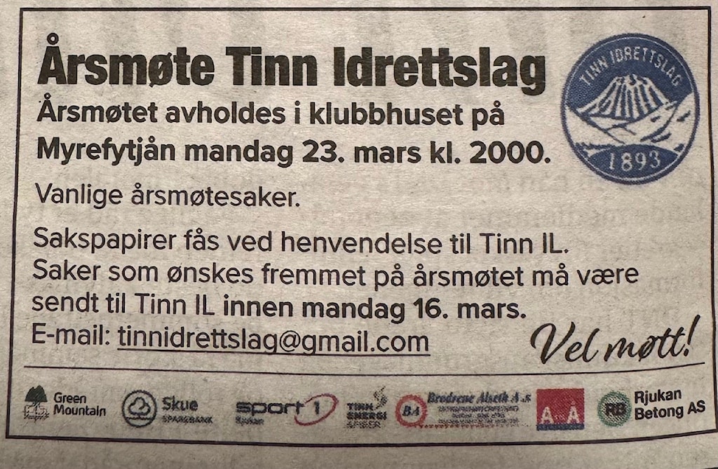 Årsmøte Tinn Idrettslag. Myrefytjån mandag 23. mars kl. 2000.